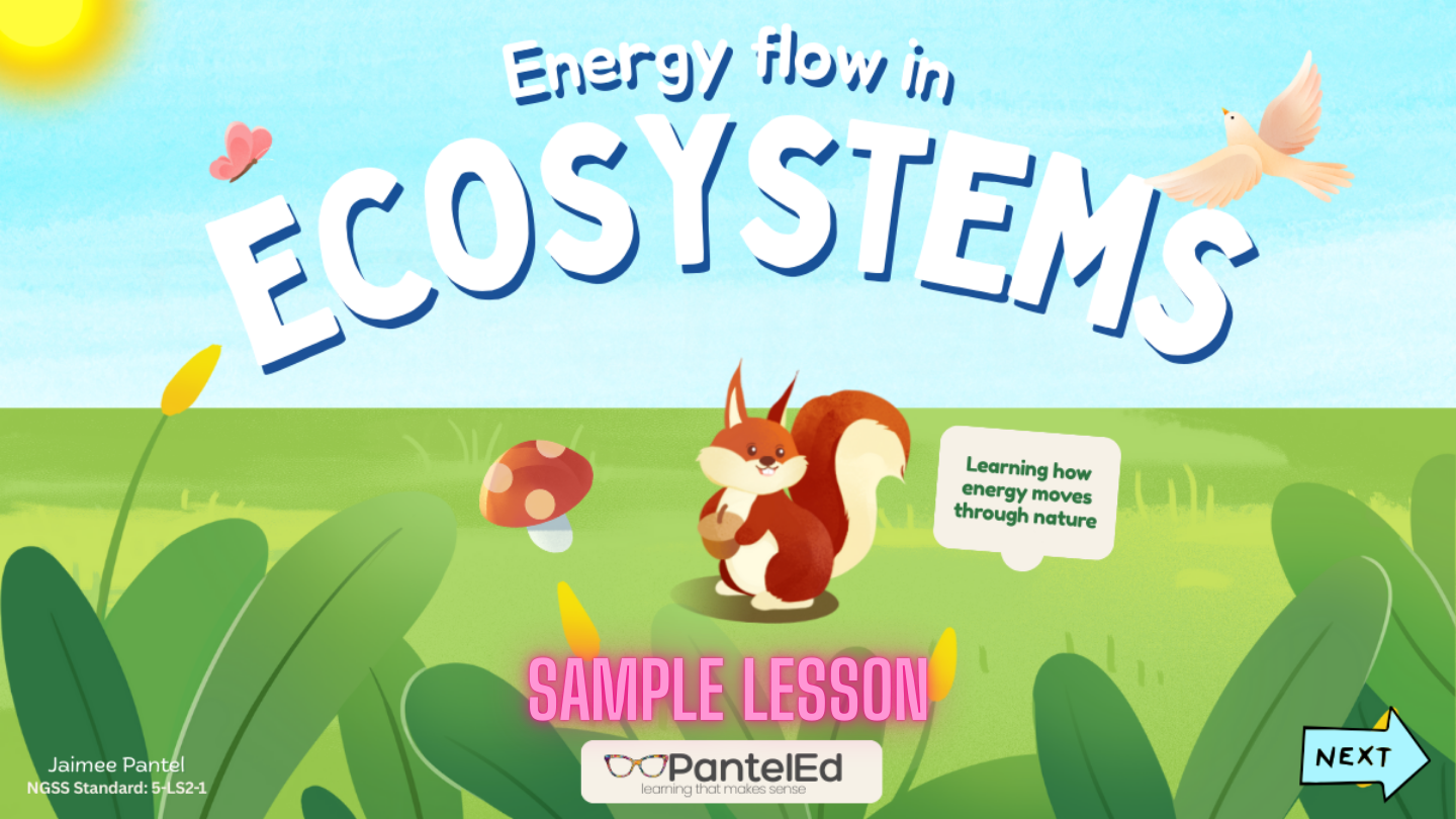 A fully designed, NGSS-aligned science lesson on energy flow in ecosystems for asynchronous upper-elementary to middle school learners. Includes narrated visuals, interactive checks for understanding, printable student materials, guided practice, and a written explanation task.